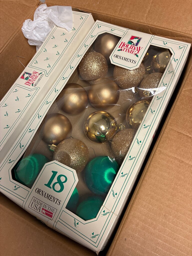 This set contains 18 decorative holiday ornaments in assorted colors including gold and green, perfect for adding a festive touch to your home decor.