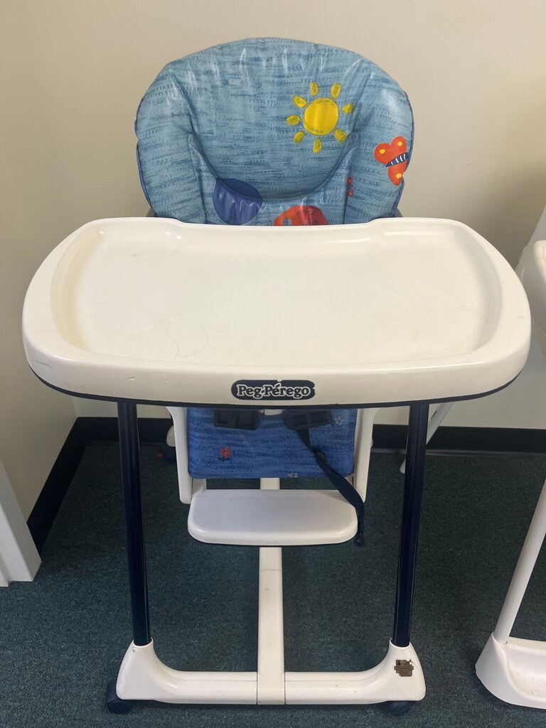 A gently used Peg Perego high chair, featuring a comfortable blue seat with playful designs. Perfect for feeding infants.