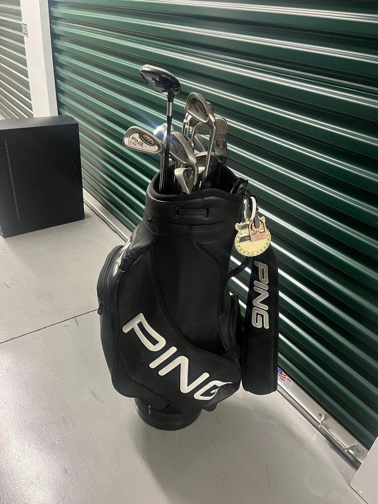 A used set of PING golf clubs in a black bag, ideal for men's golfing needs. Includes various club types for versatility on the course.
