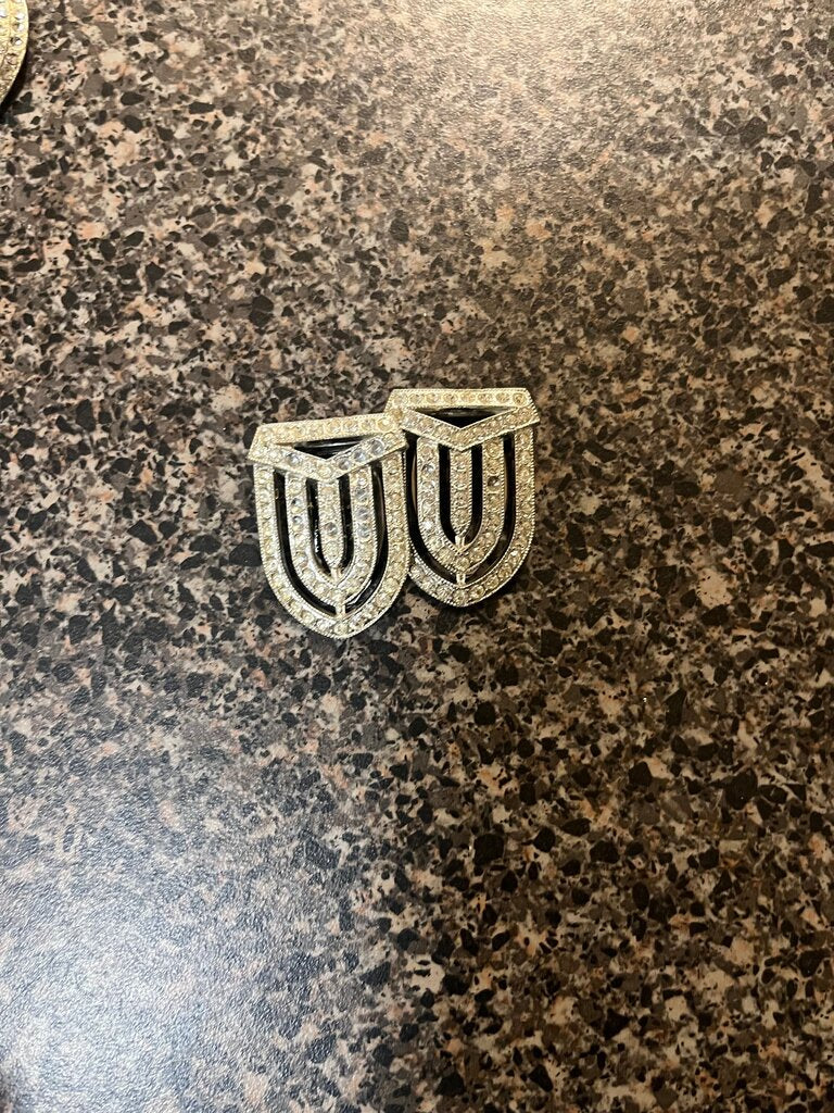 A beautiful pair of silver brooches adorned with shimmering rhinestones, perfect for adding a touch of elegance to any outfit.