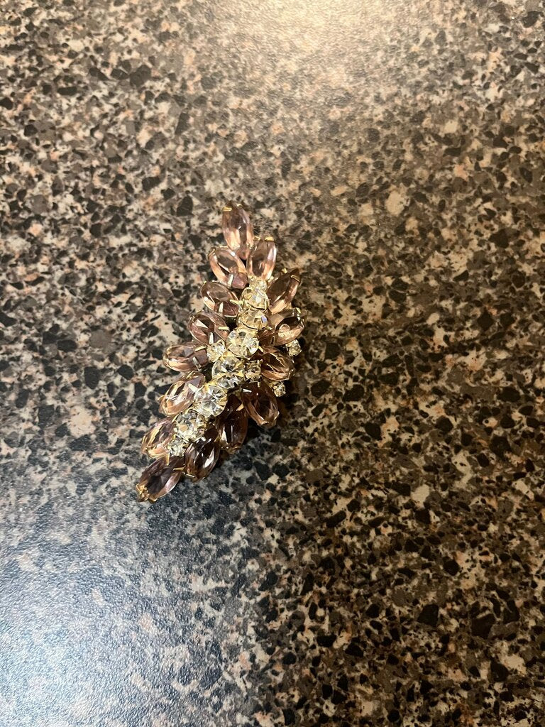 A beautiful vintage floral brooch featuring pink and clear stones, perfect for adding a touch of elegance to any outfit.