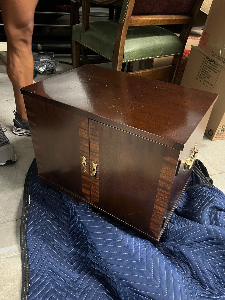 Elegant vintage wooden cabinet featuring double doors and brass handles. Perfect for storage and décor.