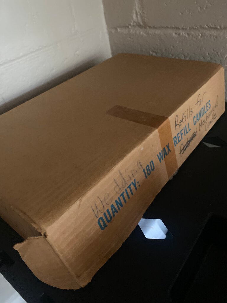 A box of white wax refill candles, perfect for various occasions including weddings and events.